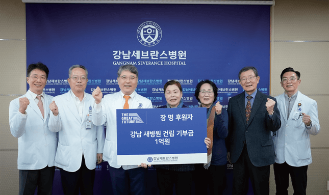 장명 후원자가 우리 병원에 새병원 건립기부금 1억 원을 후원했다. 이에 지난 3월 10일 기부금 전달식이 진행되었으며, 이 자리에는 구성욱 병원장, 이영목 진료부원장, 박민찬 새병원추진전략실장, 윤영훈 발전기금사무국장, 신경외과 최중언 명예교수 부부 등이 참석해 감사의 마음을 전했다. 박민찬 새병원추진전략실장도 “기부하여 주신 마음에 보답하기 위해 다양한 인프라와 접근성을 갖춘 새병원 건립에 부단히 노력하겠다”며 감사의 말을 전했다. 이에 장명 후원자는 “강남세브란스병원이 더 나은 환경과 조건으로 환자를 위한 노력을 할 수 있도록 도울 수 있어 기쁘고, 성공적인 새병원 건립을 기원한다”고 답했다. 한편, 장명 후원자는 금번 기부를 통하여 우리 병원과 소중한 첫 인연을 시작하게 되었다.