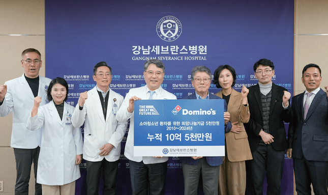 오광현 한국도미노피자 회장이 우리 병원에 소아청소년 환자를 위한 희망나눔기금 5,000만 원을 전했다. 지난 2024년 12월 17일에 진행한 기부금 전달식에는 구성욱 병원장, 임재열 연구부원장, 윤영훈 발전기금사무국장, 사회사업팀장, 발전기금팀장과 오광현 회장, 차현주 실장 등이 참석하여 기부에 감사의 뜻을 전했다. 사회사업팀에서 진행한 소아청소년 환자를 위한 기금 집행내역 보고 후, 오광현 회장은 “10년 정도 기부를 해오면서 강남세브란스병원에 후원해온 것이 뿌듯하고, 앞으로도 후원자로서 강남세브란스병원과 좋은 파트너십을 유지하겠다”며 격려의 말을 했다. 이에 구성욱 병원장은 “이렇게 긴 시간 우리 병원과 함께해주셔서 감사하고, 병원은 앞으로도 한국도미노피자와 함께 ESG경영을 해나갈 것”이라며 감사의 말을 전했다. 한편, 오광현 한국도미노피자 회장은 2010년부터 강남세브란스병원에 지속적으로 후원하고 있으며, 누적 총 10억 5,000만 원을 후원하는 등 소중한 인연을 이어가고 있다.