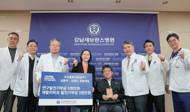남동우, 김영신 프리즘투자일임㈜ 공동대표(부부)가 강남세브란스병원에 재활의학과 발전기부금 5,000만 원, 연구발전기부금 5,000만 원 등 총 1억 원을 후원했다. 이에 지난 1월 23일에 진행한 기부금 전달식에는 구성욱 병원장, 이영목 진료부원장, 임재열 연구부원장, 윤영훈 발전기금사무국장, 박중현 재활의학과장과 남동우, 김영신 공동대표가 참석하여 기부에 감사의 뜻을 전했다. 남동우, 김영신 공동대표는 “강남세브란스병원이 환자의 입장에서 극진한 진료를 해주셔서 항상 감사하고, 모교의 병원이라 사랑하는 마음이 더 크다며 앞으로 더 많은 관심을 갖고 기부를 이어갈 수 있도록 노력하겠다”고 답했다. 한편, 남동우, 김영신 공동대표는 이번 기부를 계기로 강남세브란스병원과 소중한 첫 인연을 시작하게 되었다.
