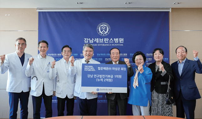 마상곤 협운해운㈜ 회장이 연구발전기부금 1억 원을 후원했다. 지난 5월 7일 진행한 기부금 전달식에 마상곤 회장, 곽부선 부부와 구성욱 병원장, 임재열 연구부원장, 소화기내과 천재영 교수, 발전기금사무국장 등이 참석해 후원에 감사의 뜻을 전했다. 마상곤 회장은 “병원에 내원하면서 생각보다 어려운 사람들이 많다는 것을 느끼게 되어 기부를 시작하게 되었다. 어려운 사람들에게 최상의 진료를 제공할 수 있도록 강남세브란스병원의 발전을 위해 잘 사용해달라”며 당부의 말을 전했다. 마상곤 회장은 금번 기부를 함으로써 총 2억 원의 기부를 달성했으며, 내년에 추가 후원금 1억 원을 약정했다. 또한 THE 미래 발전후원회 위원으로서의 인연을 이어가고 있다.