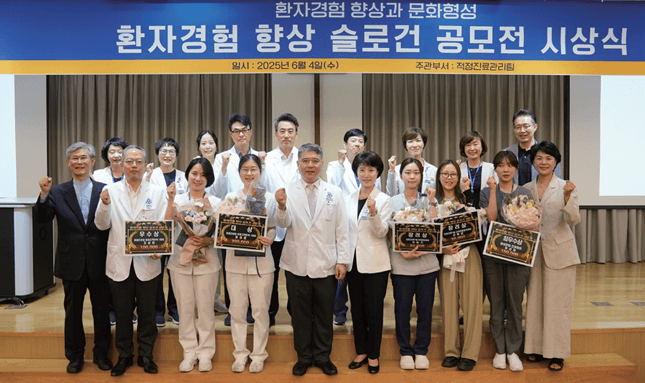 우리 병원은 최근 환자경험 향상을 위한 다양한 활동을 진행했다. 우선 환자경험 향상 슬로건 공모전 시상식이 6월 4일 병원 대강당에서 열렸다. 시상식에는 구성욱 병원장, 이영목 진료부원장, 장철호 적정진료관리실장, 안경아 간호국장, 주수용 사무국장 등 200여 명이 참석했다.