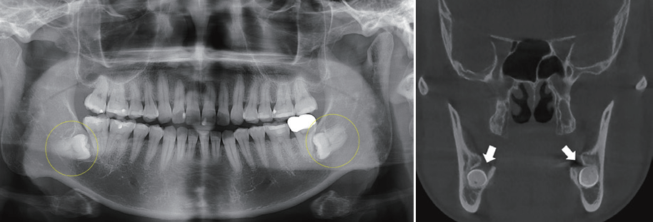 특히 치과에서 자주 촬영하는 2차원적인 파노라마 방사선 사진상에서는 사랑니가 완전히 묻혀 있는 것처럼 보이지만 3차원 컴퓨터 단층촬영 시에는 볼이나 혀 쪽 상방에 뼈가 없는 경우가 있습니다(그림). 이러한 경우 중년에 증상이 발생하여 내원하는 분이 더러 있습니다. 따라서 파노라마 방사선사진에서 사랑니가 완전히 뼈에 묻혀 있는 것으로 관찰되는 경우에도 추적 관찰이 필요할 수 있습니다.
