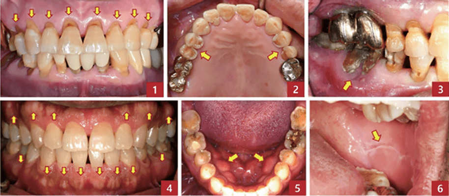 교합력이 점차 강해지고 있는 임상적 신호들. 1. 치아 목 부분이 패이는 다수의 굴곡파절(abfraction) 2. 소구치 교합면의 중등도 마모 및 파절 3. 대구치의 치은 퇴축 및 치근 노출 4. 치조골에 보이는 전반적인 골융기(exostosis) 5. 하악 설측에 나타나는 하악골융기(torus) 6. 협측 구강점막에 백색선(linea alba)으로 나타나는 치아 자국.