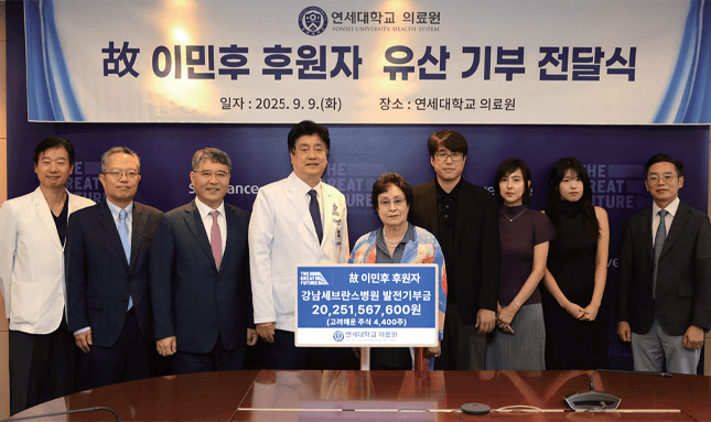 고 이민후 후원자가 지난해 9월 9일 우리 병원 발전기부금으로 고려해운 주식 4,400주를 기부했다. 주식 평가 금액은 약 203억 원으로, 유산 기부로는 연세의료원 기준 역대 최고액이다. 의료원장실 회의실에서 열린 유산 기부 전달식에는 후원자의 아내 변양자 여사와 아들 이승영 씨 등 가족들과 금기창 의료원장, 구성욱 강남세브란스병원장, 이영목 강남 진료부원장, 이상철 발전기금사무국장, 윤영훈 강남 발전기금사무국장 등이 참석했다.
