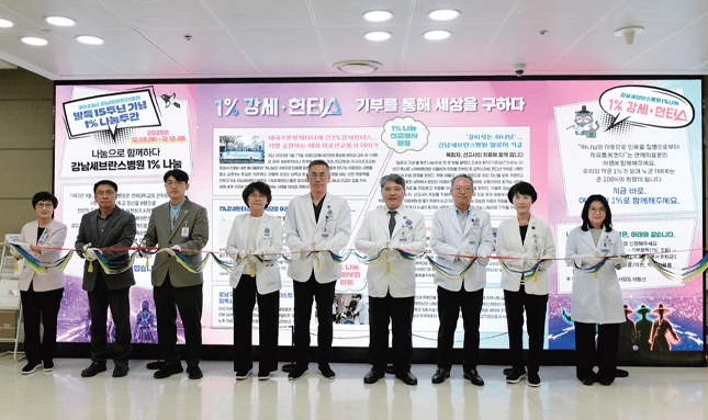 우리 병원이 ‘2025 강남세브란스병원 1% 나눔 주간 행사’를 진행했다. 1% 나눔은 교직원이 자발적으로 본봉의 1%를 기부해 경제적 어려움을 겪는 환자와 소외계층을 돕는 사회공헌 프로그램이다. 현재 교직원 675명이 1% 나눔 활동에 참여하고 있으며, 누적 기금 총 22억 4,000만 원이 조성됐다. 조성된 기금은 의료선교, 사회사업 후원금 등 나눔의 씨앗으로 활용된다.