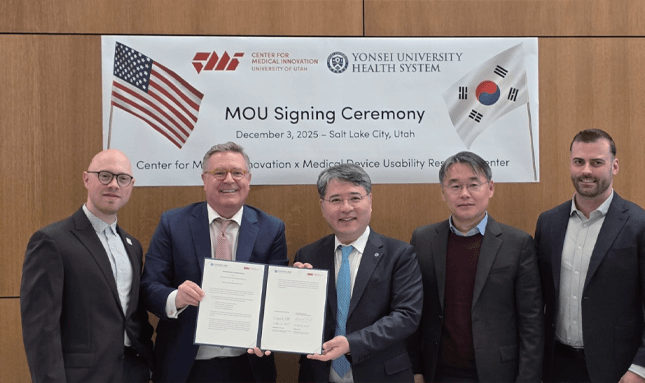 연세의대 의료기기산업 특성화대학원이 미국 유타대학교 의료혁신센터(Center for Medical Innovation, CMI)와 글로벌 의료기기 개발 협력 강화를 위한 업무협약을 체결했다. 지난해 12월 3일 미국 유타대학교에서 열린 협약식에는 구성욱 강남세브란스병원장 겸 의료기기산업학과 주임교수와 마크 폴(Mark H. Paul) 유타대학교 의료혁신센터장 등 관계자 10여 명이 참석했다.