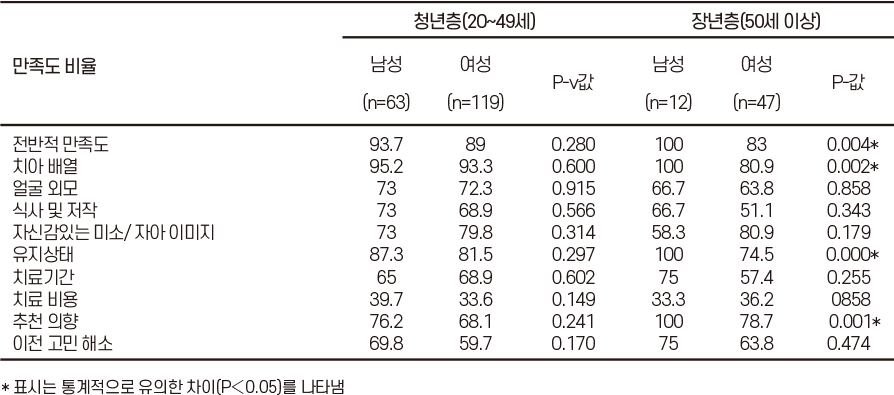 마지막으로 치료 만족도 설문 연구에서는 성인 교정 환자 241명(여성 166명, 남성 75명)을 대상으로 주관적인 치료 만족도를 조사했습니다. ‘매우 만족’과 ‘만족’을 합산한 비율은 남성 95.4%, 여성 86.5%로, 남녀 모두 높은 만족도를 보였습니다. 특히 50세 이상 남성 환자는 치아 배열, 유지 상태 등 전반적인 항목에서 여성보다 유의하게 높은 만족도를 나타냈습니다(p<0.05).