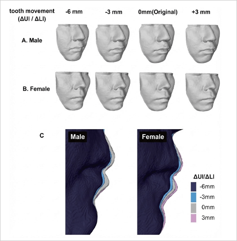 두 번째로 진행된 딥러닝 기반 3차원 얼굴 시뮬레이션 연구에서는 성별과 연령, 계획된 치아 이동 양상에 따른 얼굴 연조직 변화를 분석했습니다. 우리 연구팀이 강남세브란스병원의 치료 후 빅데이터를 이용해 개발한 교정치료 후 얼굴 시뮬레이션 알고리즘을 적용한 결과, 동일한 교정치료를 시행하더라도 여성은 남성에 비해 치아 이동량에 비례한 연조직 변화가 더 광범위하고 뚜렷하게 나타났습니다. 특히 입술과 뺨 부위의 후방 이동과 볼륨 감소가 여성에서 두드러지게 관찰되어, 여성 연조직이 교정치료에 더욱 민감하게 반응함을 확인할 수 있었습니다.