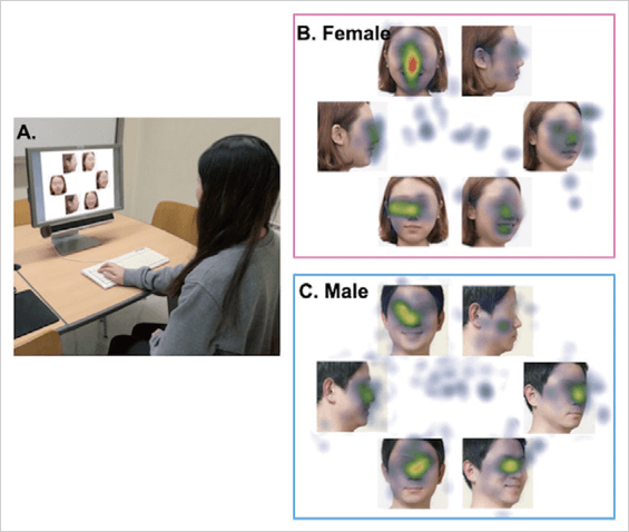 첫 번째 연구에서는 20세 이상 성인 참가자(여성 15명, 남성 18명)를 대상으로 다양한 각도와 표정의 얼굴 사진을 제시하고 매력도를 평가하도록 했습니다. 이와 동시에 시선추적(Eye-tracking) 기법을 활용해 매력도를 판단하는 과정에서 얼굴의 어느 부위에 시선이 집중되는지를 분석했습니다. 그 결과, 남녀 모두 미소를 지은 정면 얼굴에서 시선 고정 시간이 가장 길었으며, 특히 여성은 남성에 비해 미소 지은 정면 얼굴에 유의하게 더 긴 시선 고정 시간을 나타냈습니다(p<0.05).